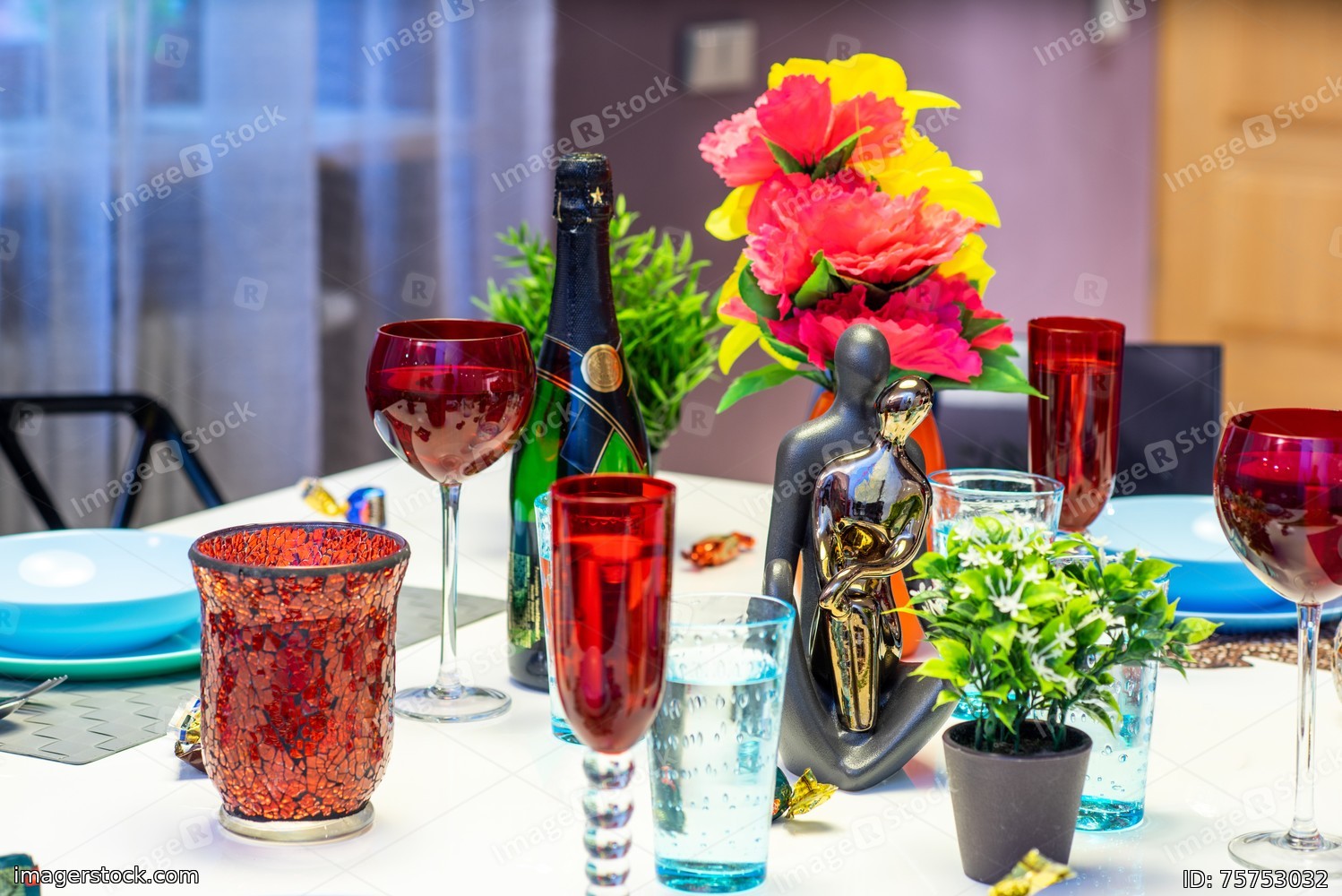 Green bottle. Red wine glasses. Vase with flowers.