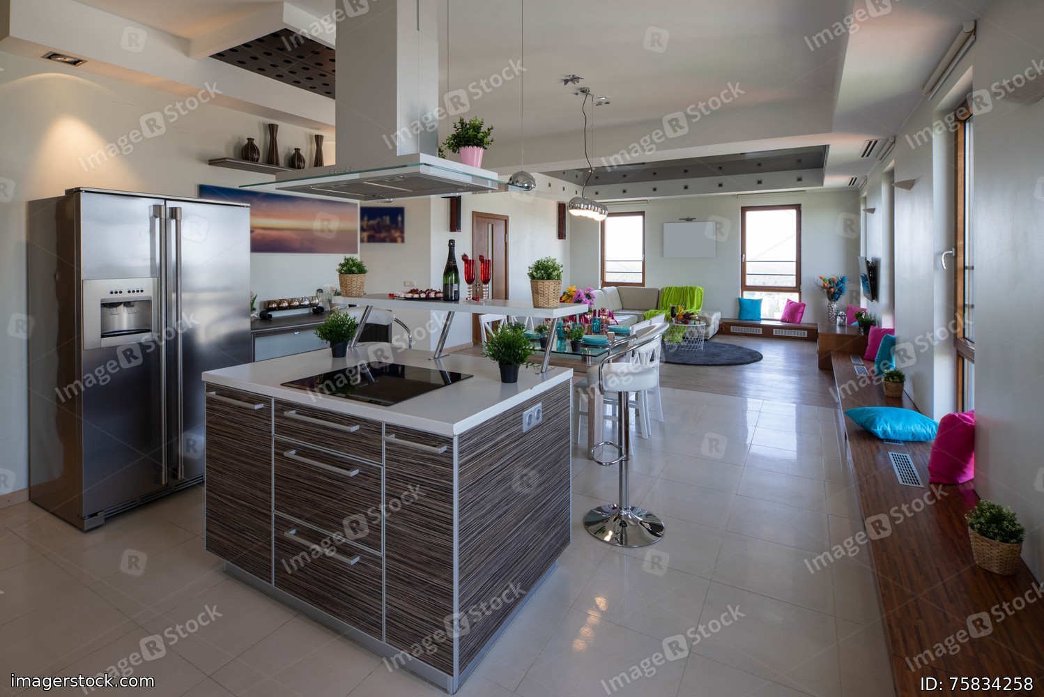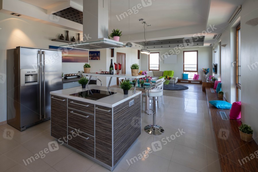 Modern interior of studio apartment in light tones. Living room and kitchen.