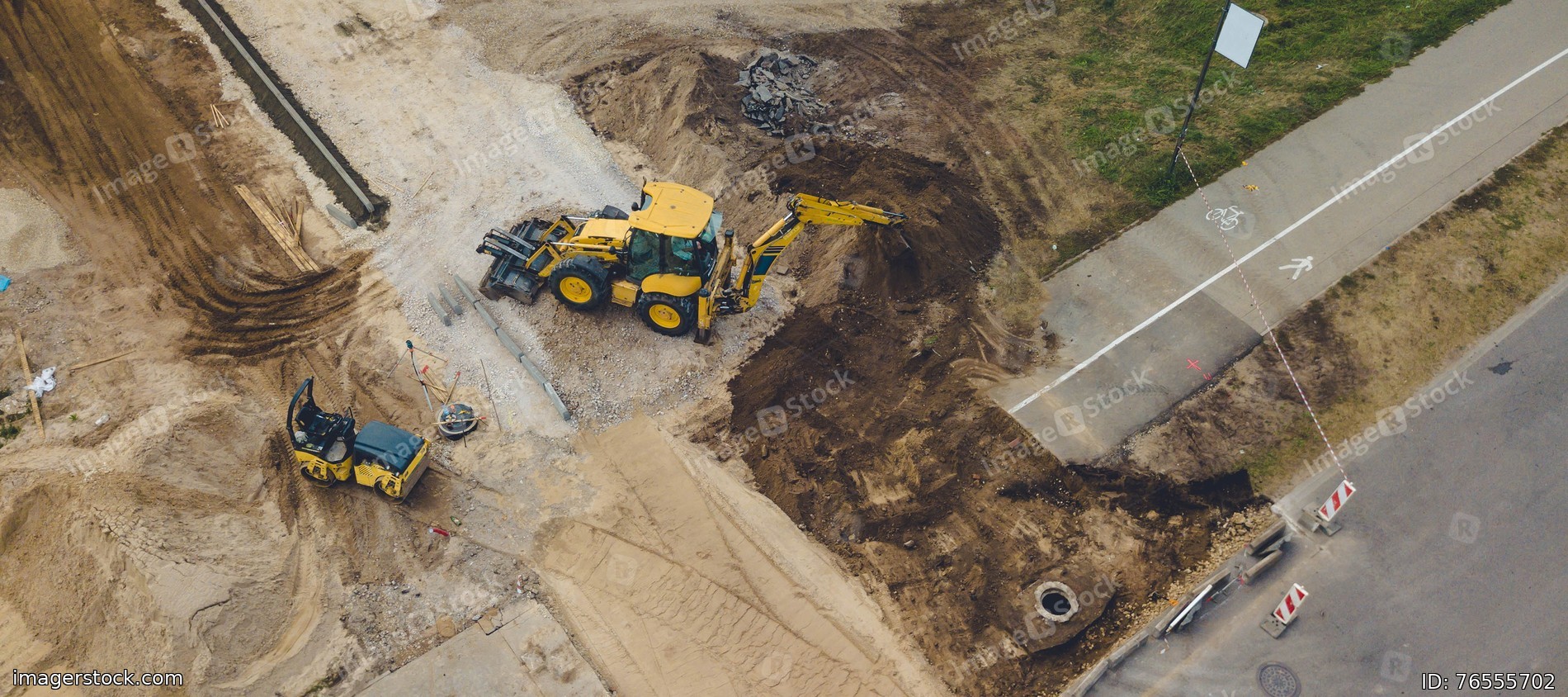 Aerial view of road construction works. Heavy machinery and construction equipment.