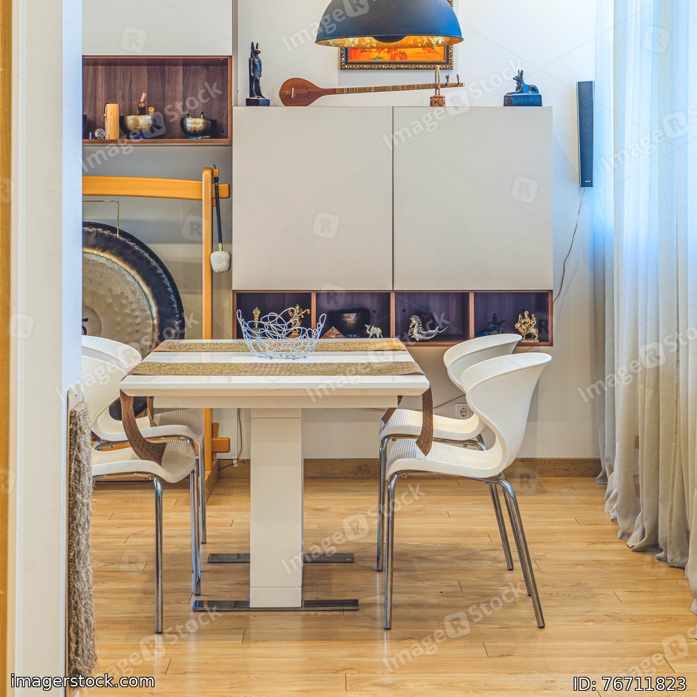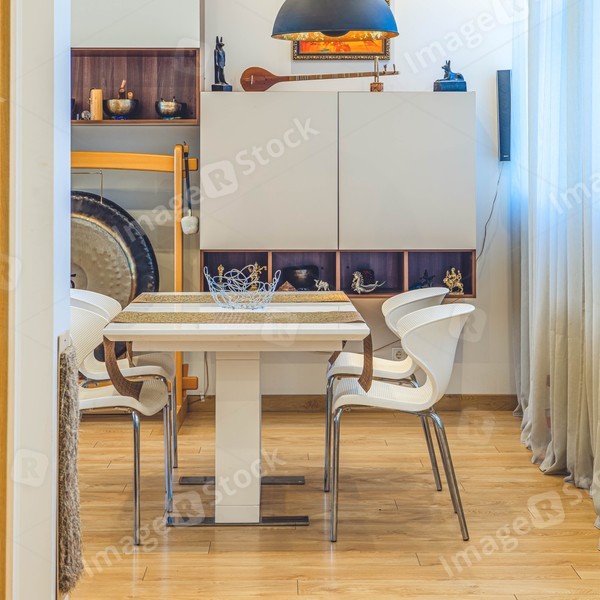 Modern interior of living room in luxury studio apartment. Table and chairs. Home decor.