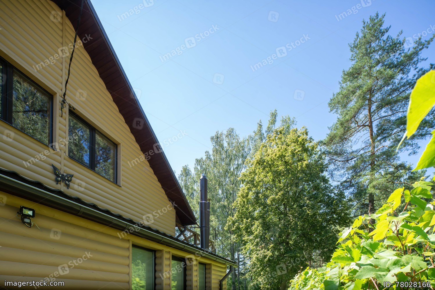 Modern exterior of private countryside house. Siding wall with windows. Sunny summer day. Green trees.