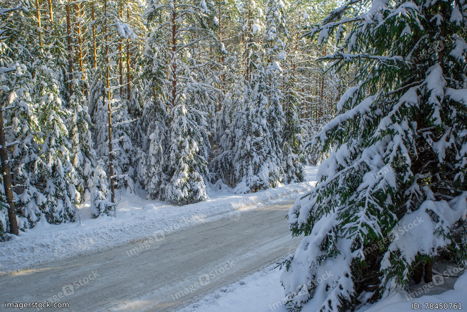 Scenic landscape of road between winter forest. Trees covered by snow.