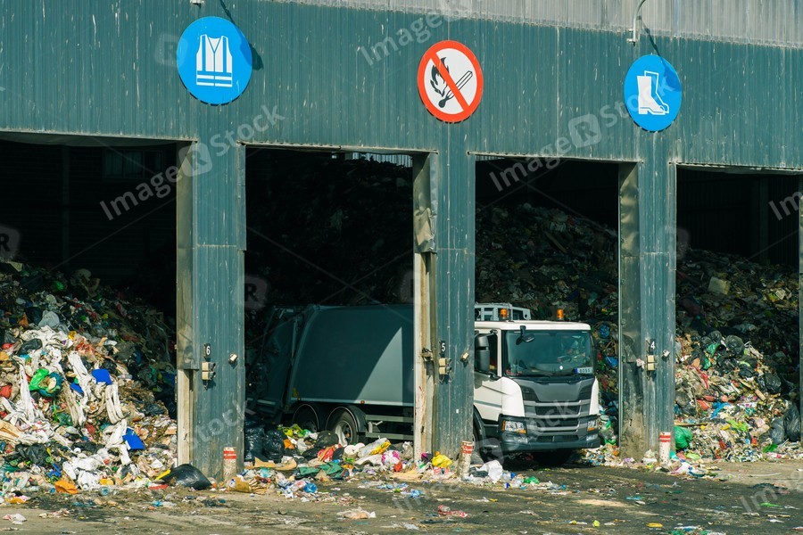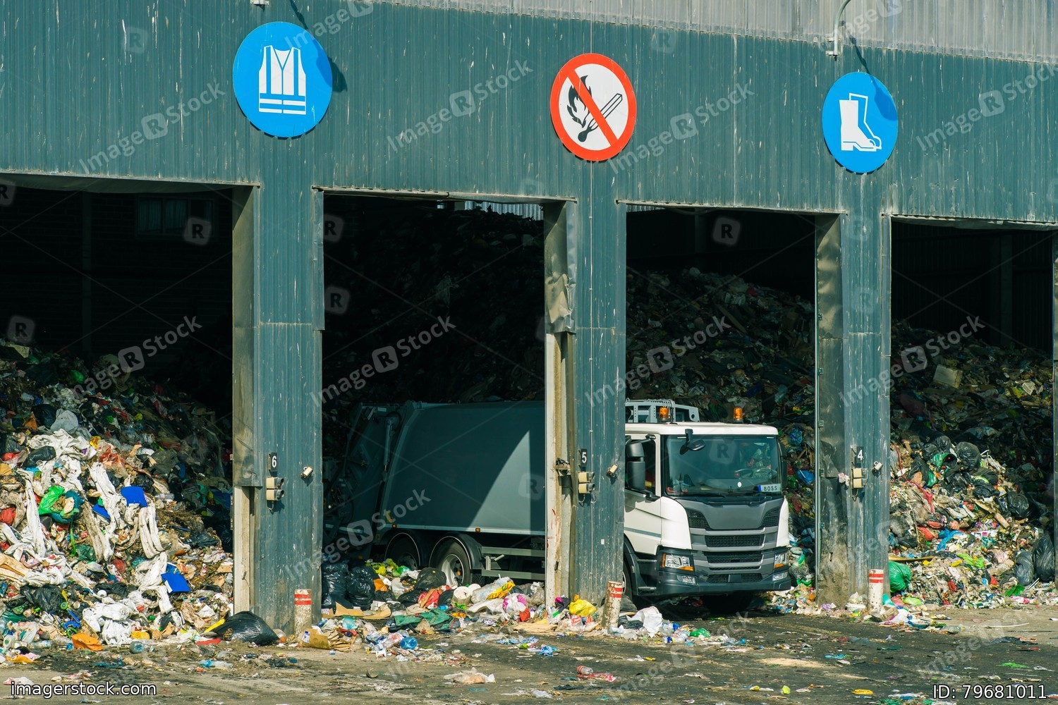 Huge industrial warehouse of household waste. Dump of big city. White garbage truck. Preparation for recycling.