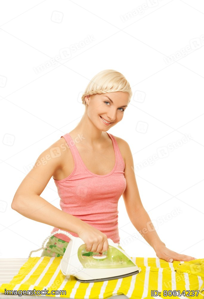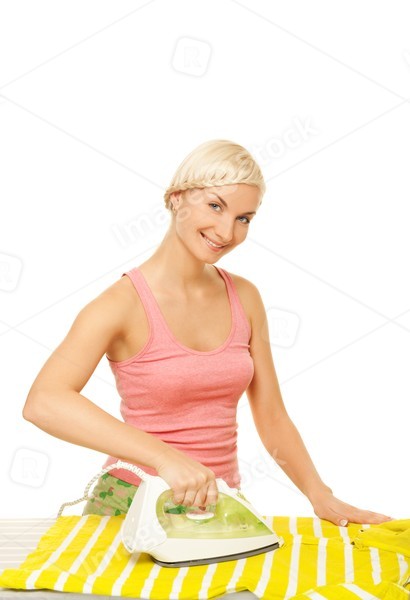 Beutiful woman ironing clothes. Isolated on white background