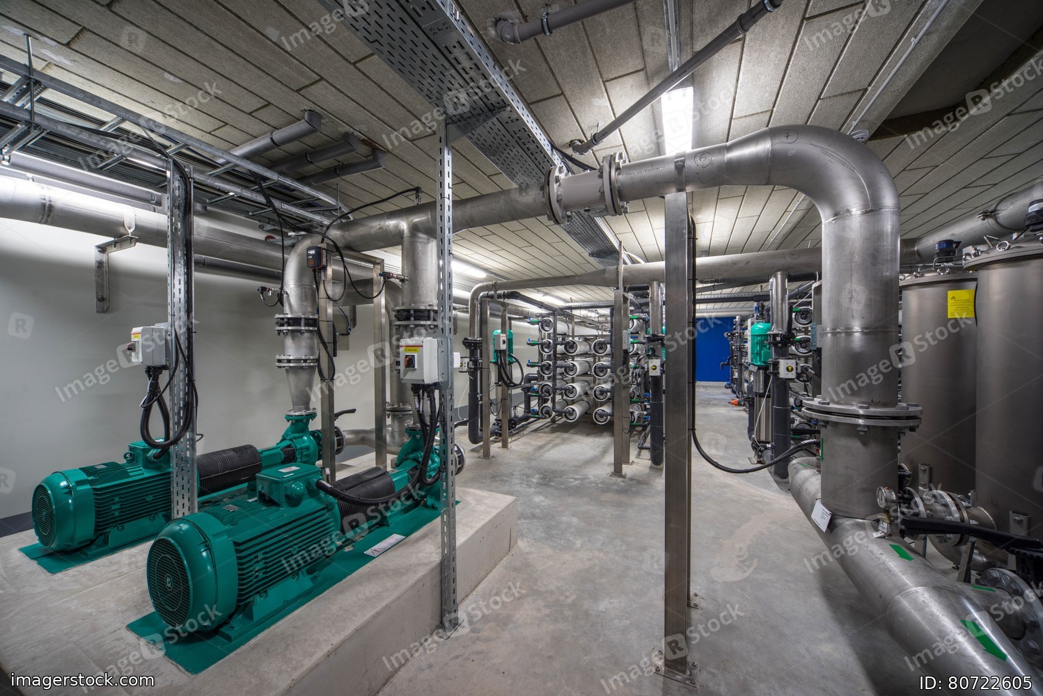 Interior of industrial water treatment and boiler room. Single-stage, low-pressure centrifugal pump. Heating system.