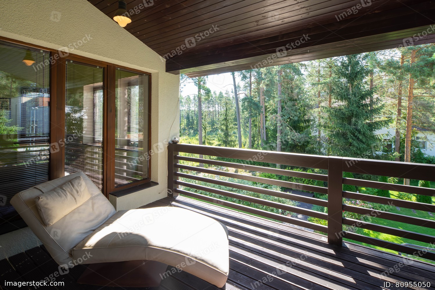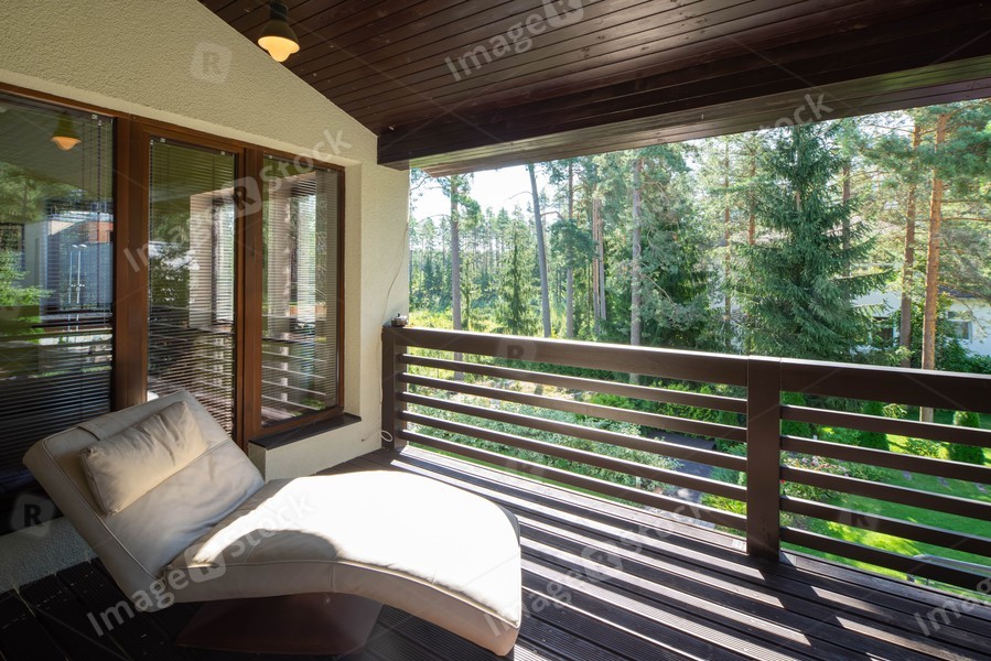 Cozy lounge chair on wooden terrace. Luxury cottage. Green forest at sunny day.