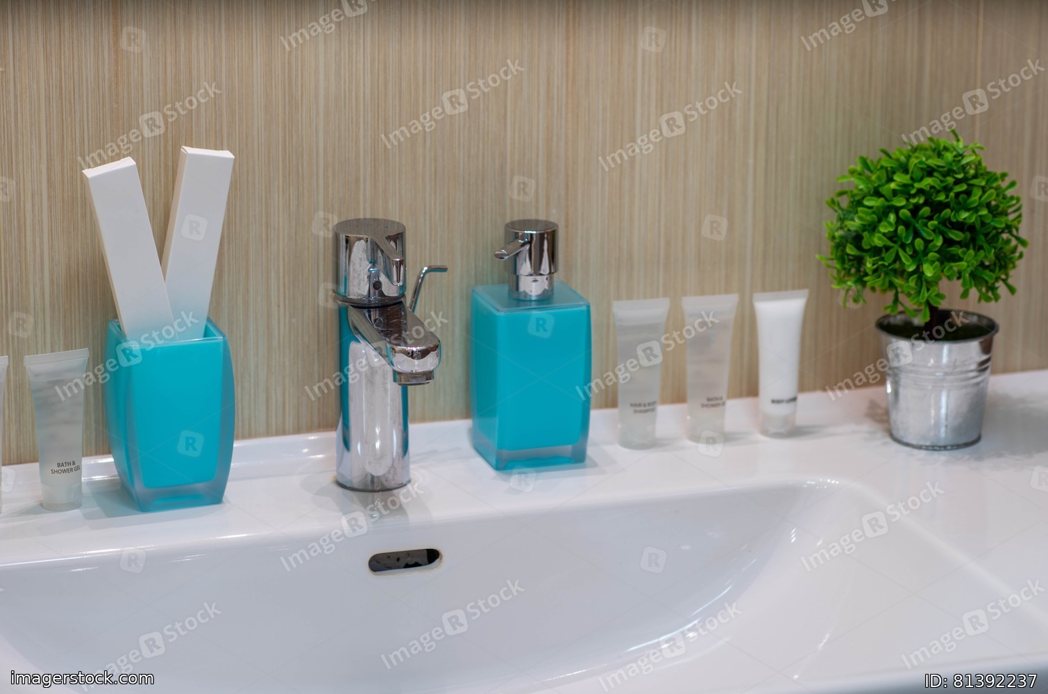 Modern interior of bathroom. White sink with soap and cosmetics. Decorative flower.