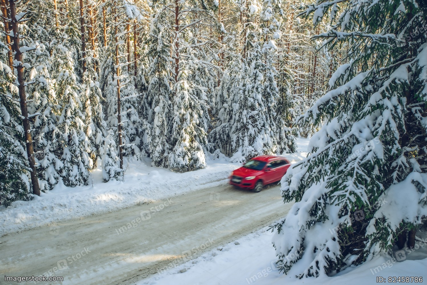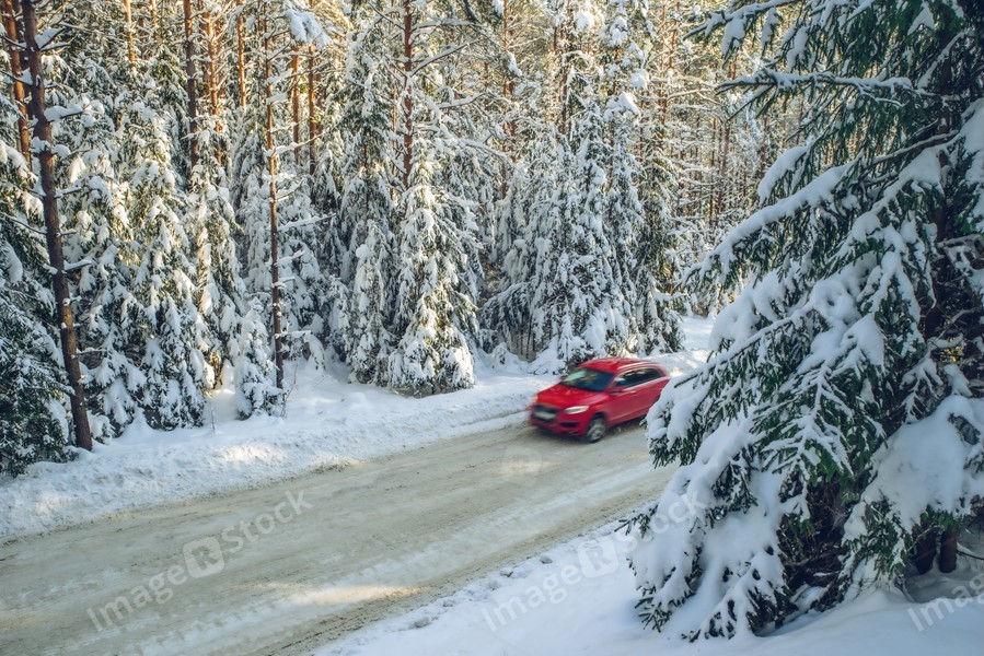 Scenic landscape of winter forest. Trees covered by snow. Car on road.