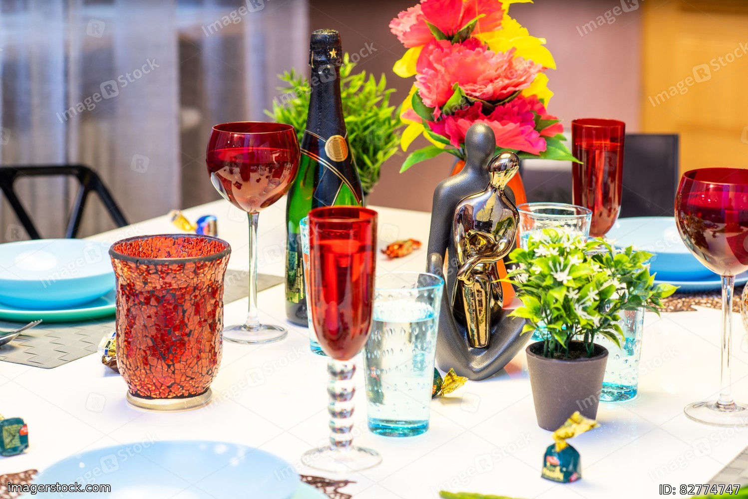 Green bottle. Red wine glasses. Vase with flowers.