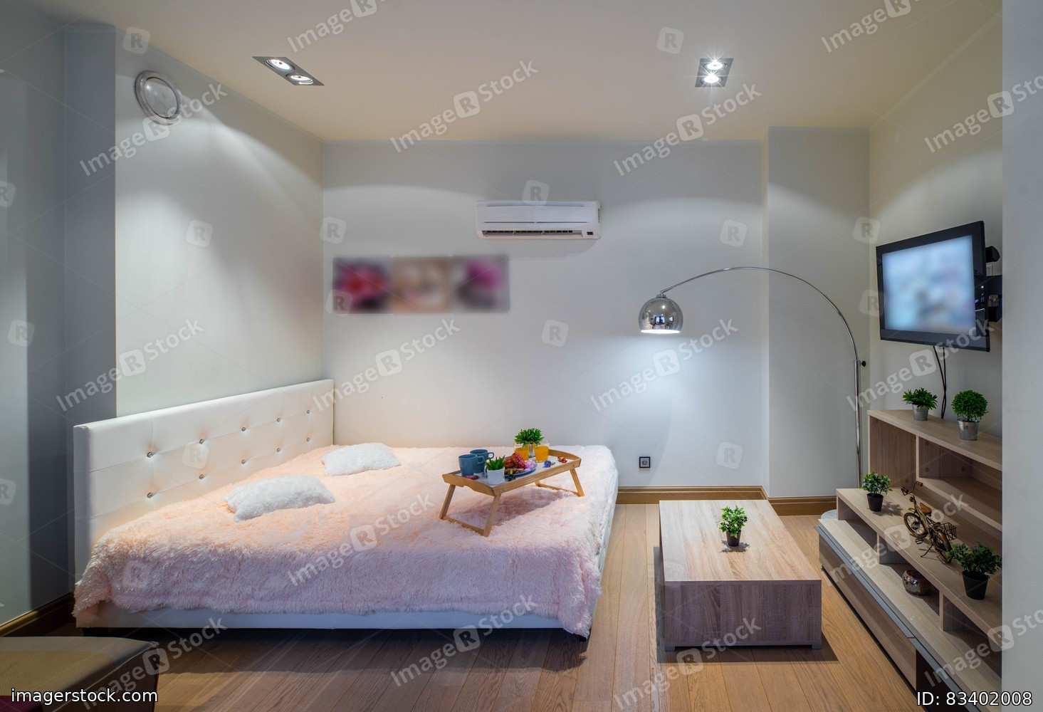 Interior of modern studio apartment. Bedroom with furniture.
