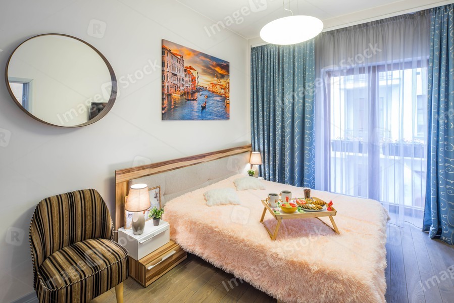 Modern interior of spacious bedroom. King-size bed.