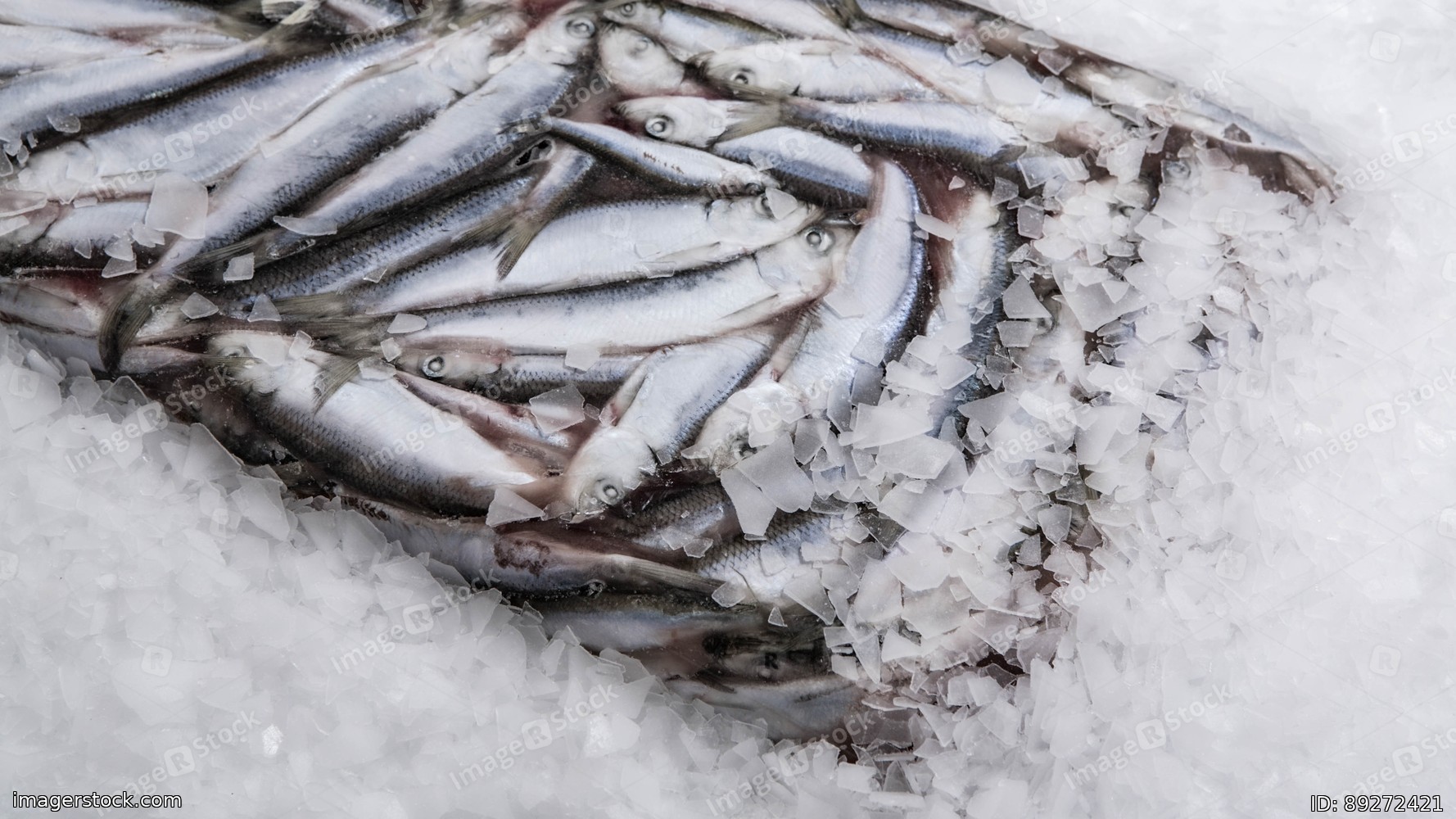 Close-up of sprat brick on the ice in fish market. Winter fishing. Frozen small silver fish.