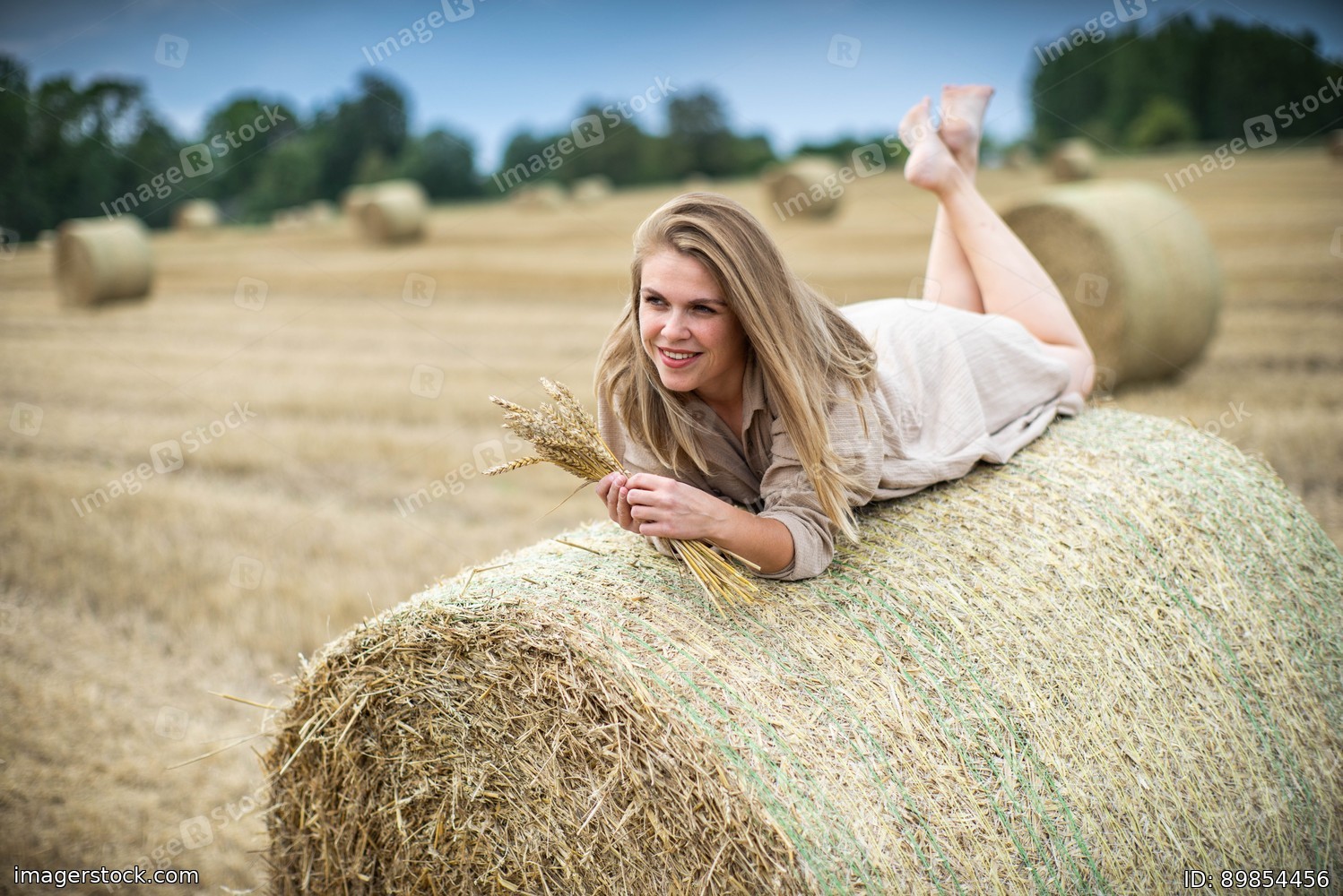 Beautiful happy woman lying on a haystack.