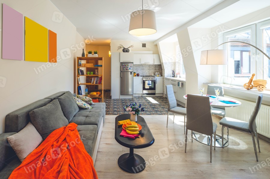 Spacious studio apartment with furniture. Living room. Kitchen. Light interior.