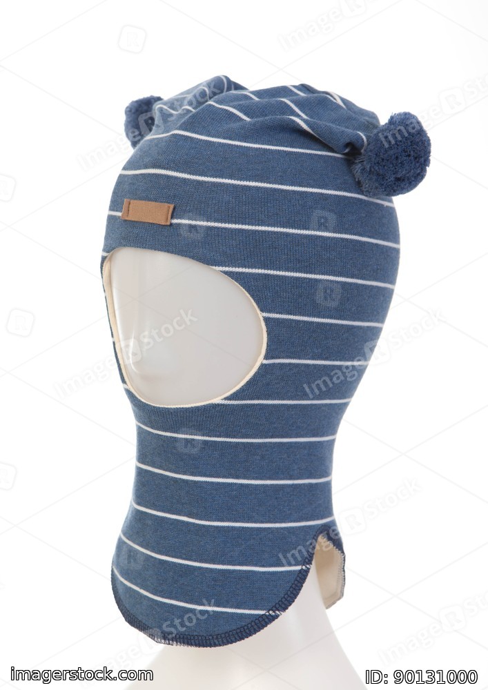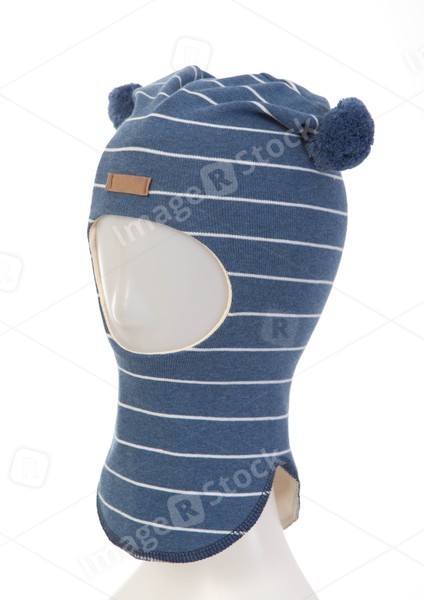 White background. Blue children hat with pompons. Winter fashion.