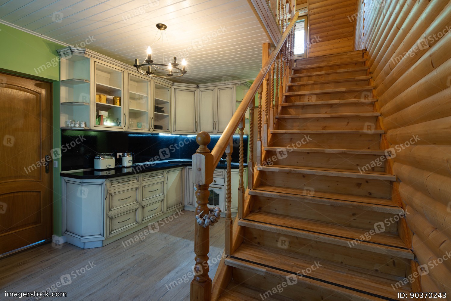 Modern interior of private country house. White kitchen set. Wooden stairs to the second floor.