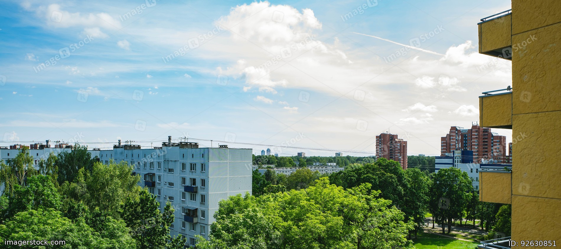 Sunny summer cityscape of Riga, Latvia. Residential buildings. Modern exterior. Green trees. Top view.