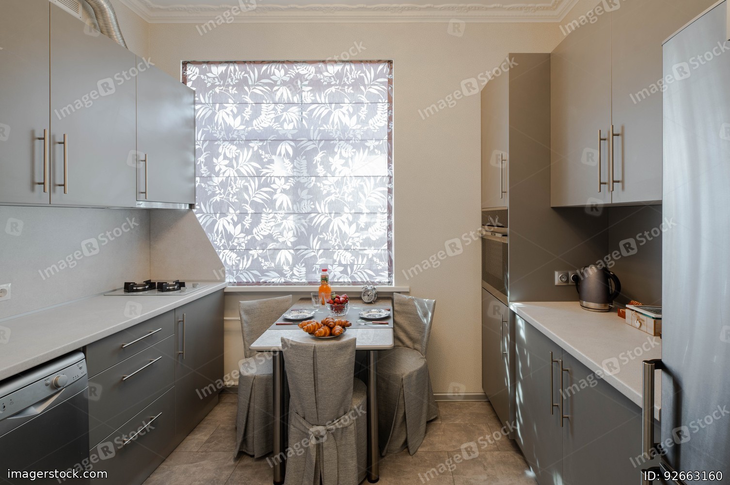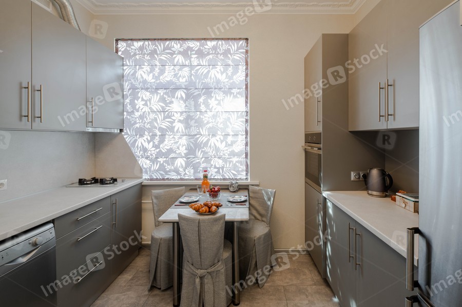 Front view on the table and window in modern kitchen interior.