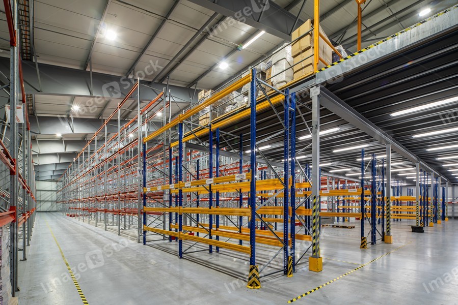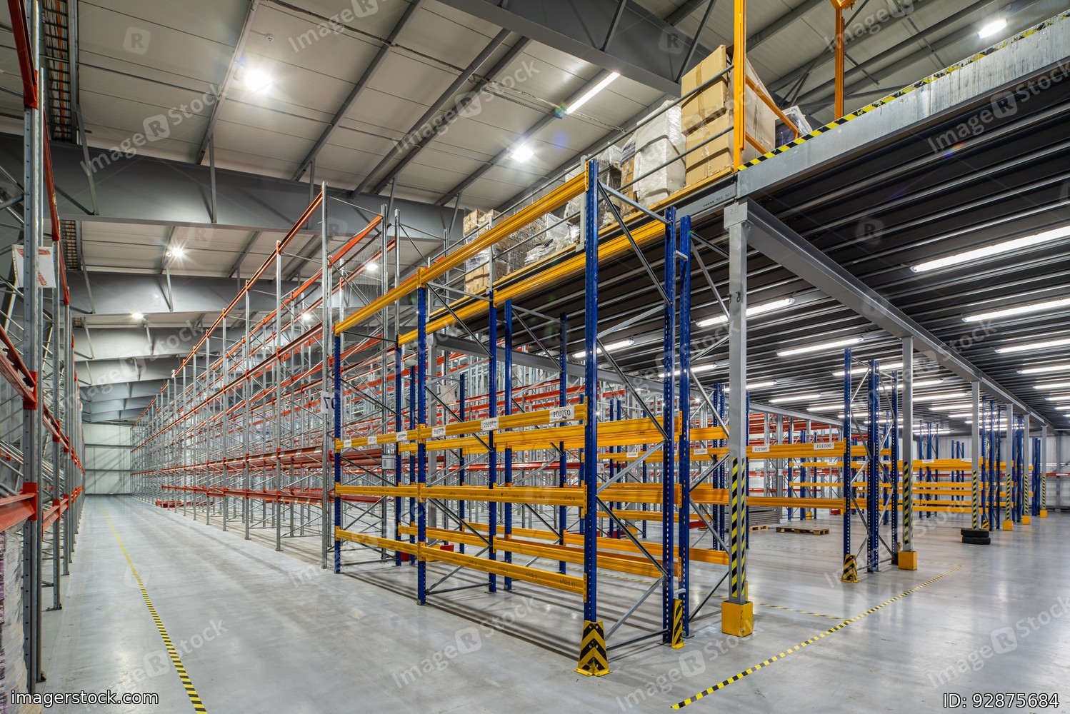 Interior of huge empty storehouse. Industrial warehouse racking.