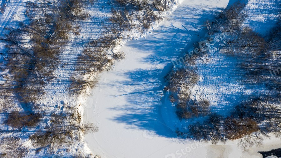 Top view of scenic winter forest and frozen river. Winter landscape.
