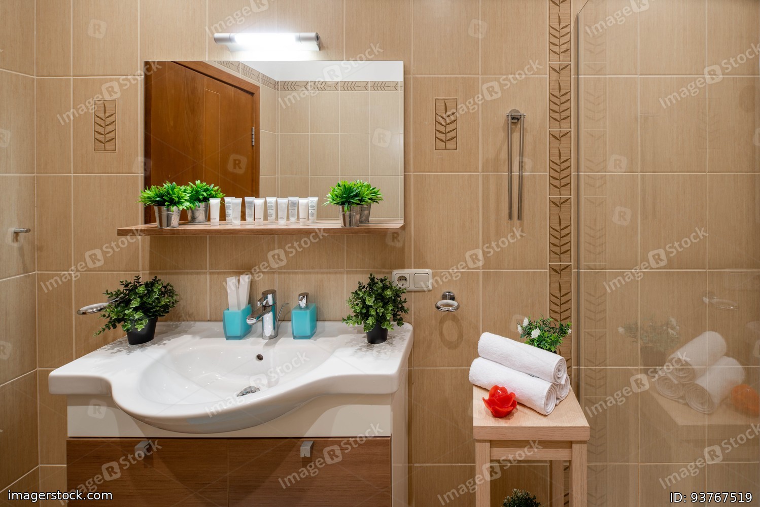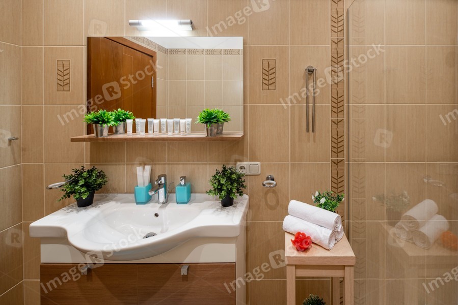 Modern luxury interior of bathroom. White sink, mirror and shelf with cosmetics.