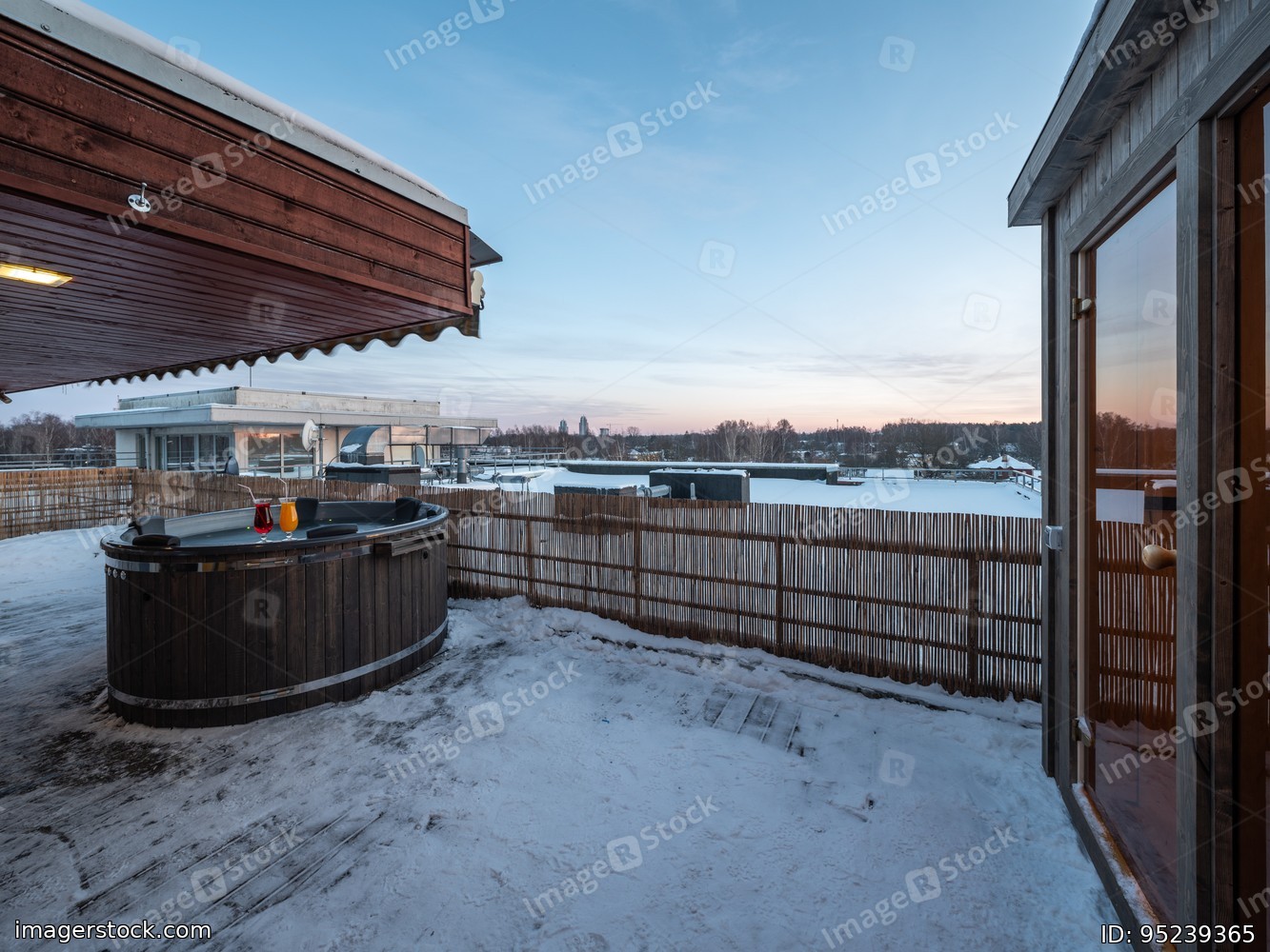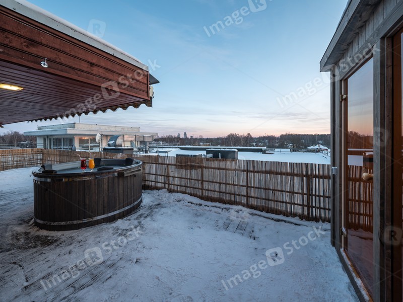 Open terrace with hot outdoor wooden bath tub. Luxury private house.