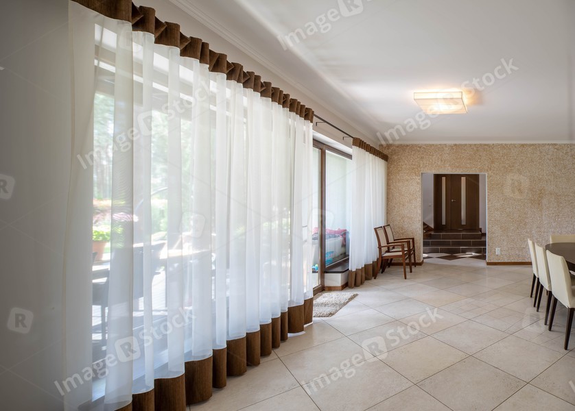 Modern brown interior of spacious apartment. Tulle curtain and panorama windows. Tile floor.