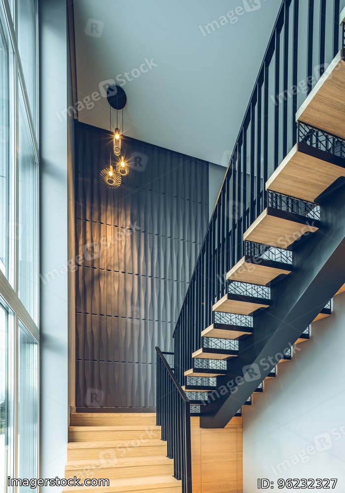 Wooden staircase with illumination in luxury private house. Interior.
