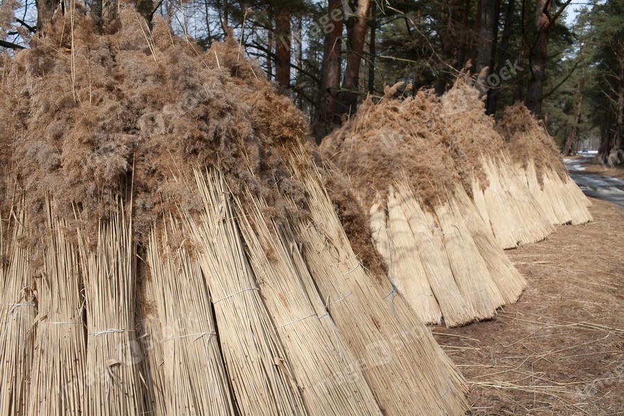 Harvesting cane for making roofs. Winter landscape.