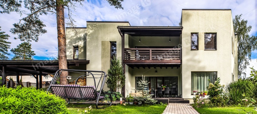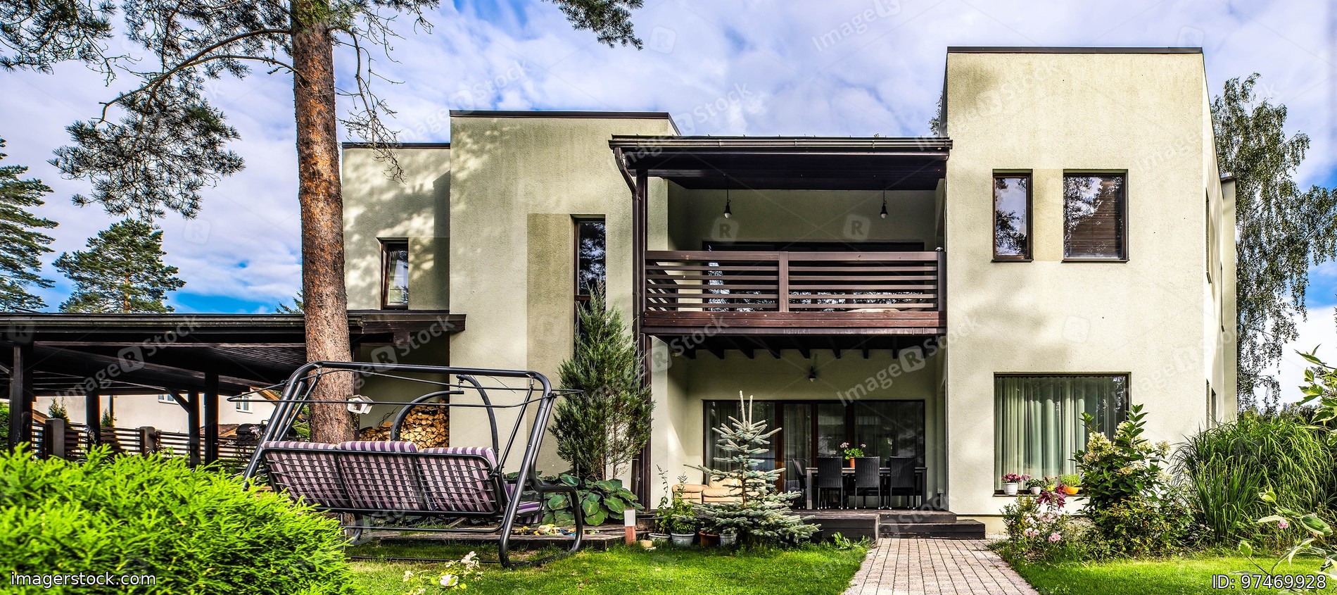 Modern exterior of luxury cottage with wooden terrace. Swing in garden. Huge pines, green grass, beautiful architecture.