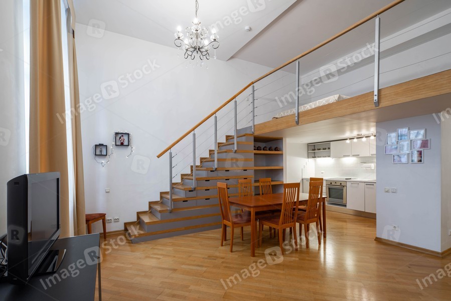 Interior in warm tones. Private house. Staircase to the second floor. Kitchen set.