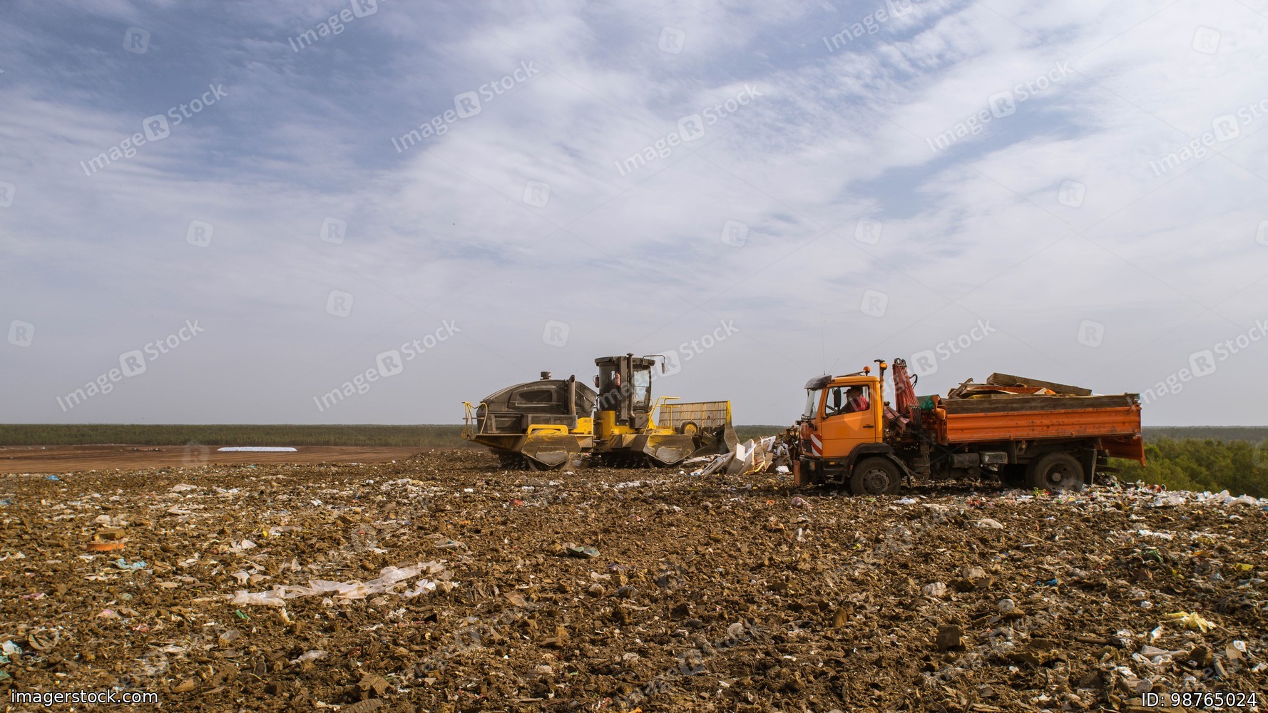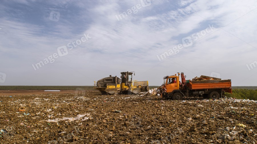 Waste sorting on landfill of big city. A lot of garbage. Truck with manual hydraulic manipulator. Yellow tractor.