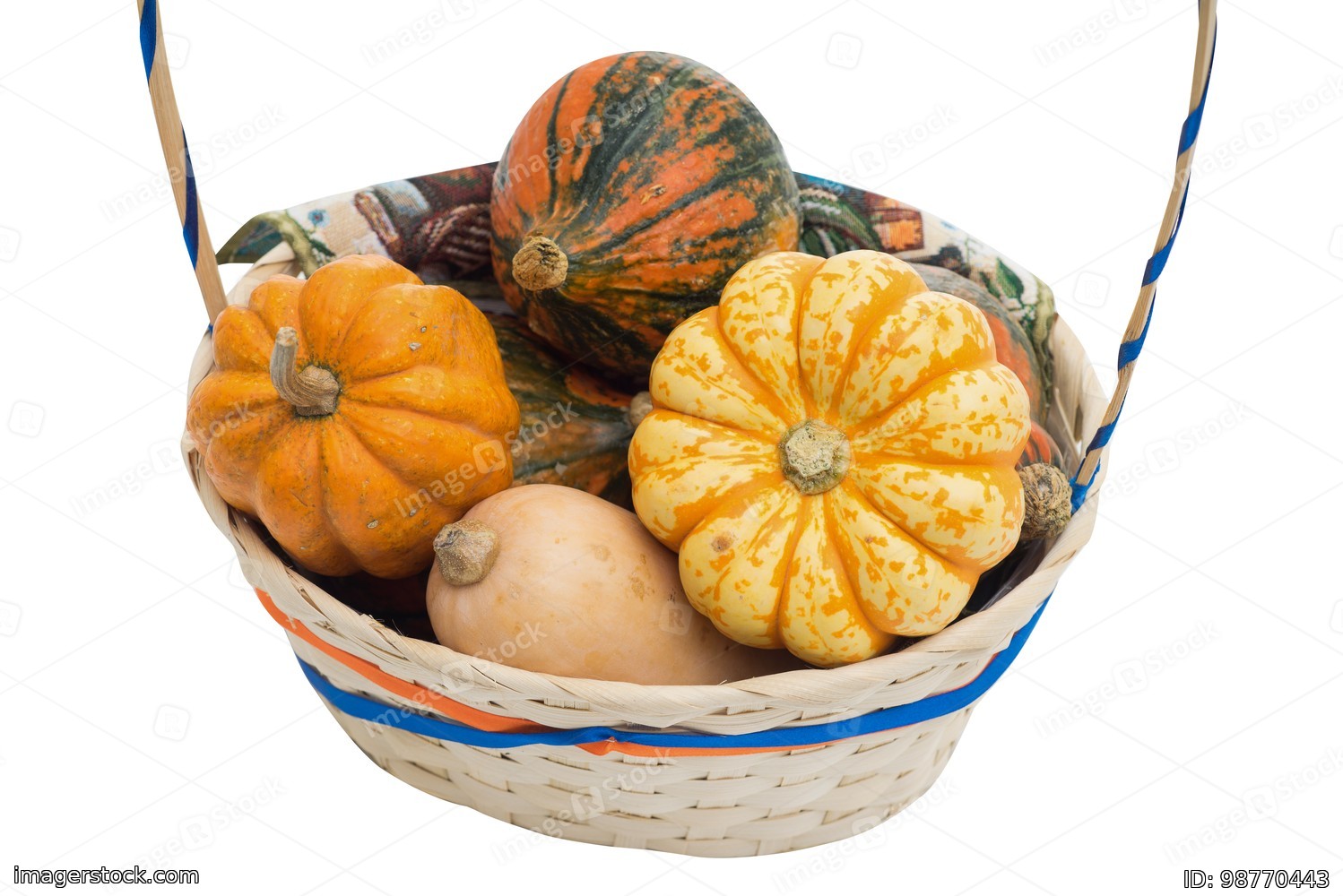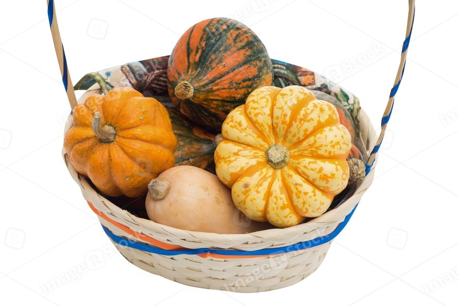 Basket with pumpkins on a white background.