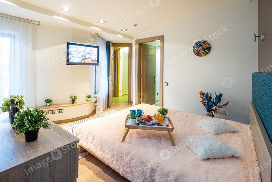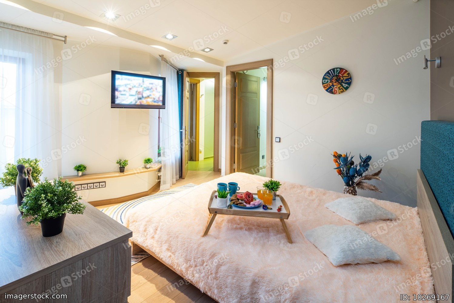 Interior of bedroom. Modern apartment. King-size bed. Tray with food.