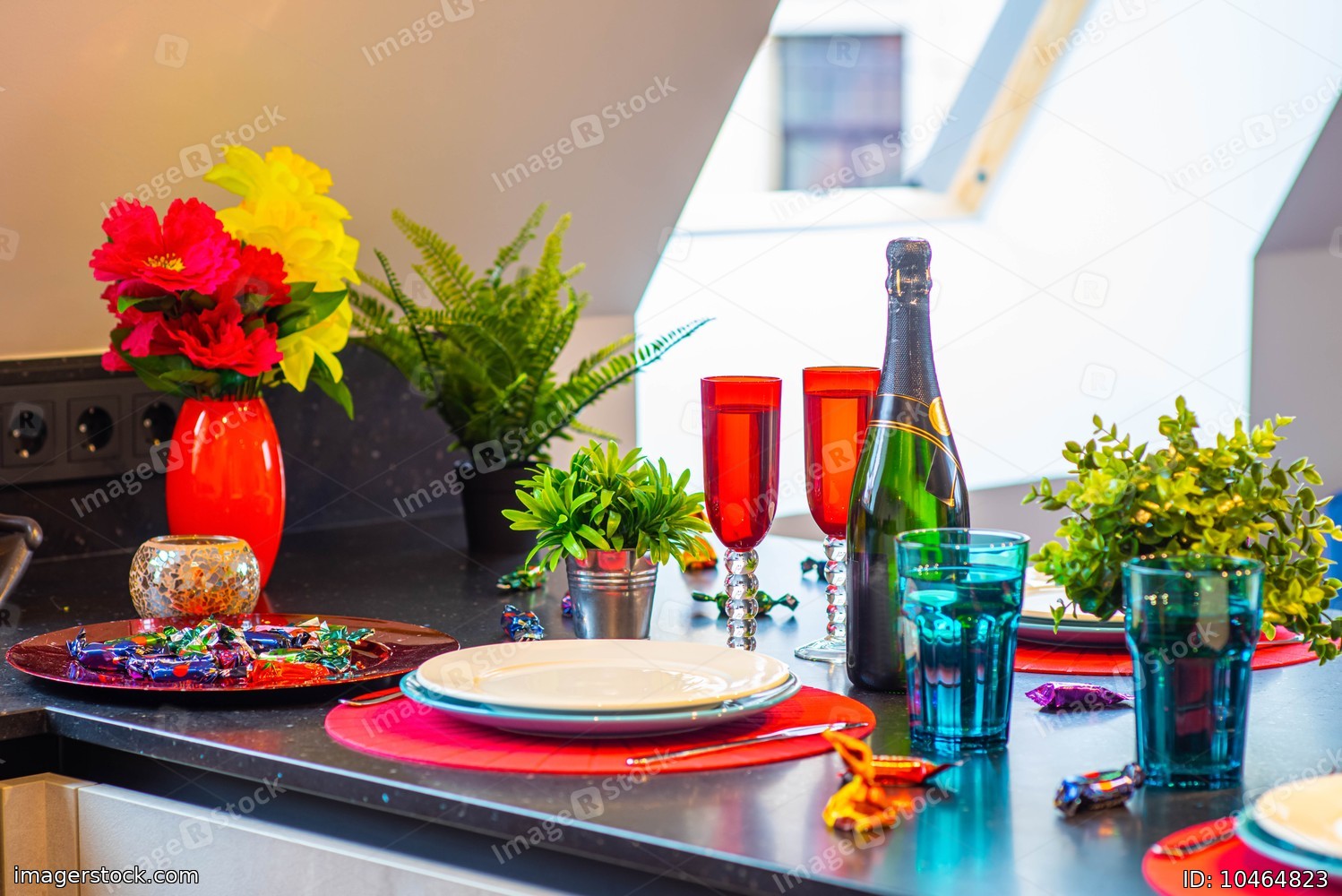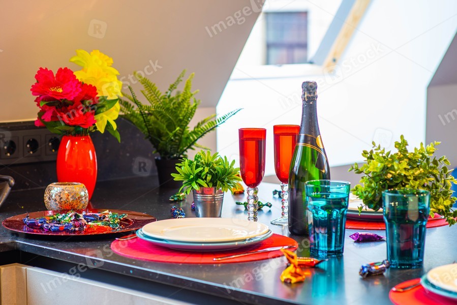 Close-up of the set table. Clean dishes and glasses. Bottle of wine. Decorative flowers. Modern interior.