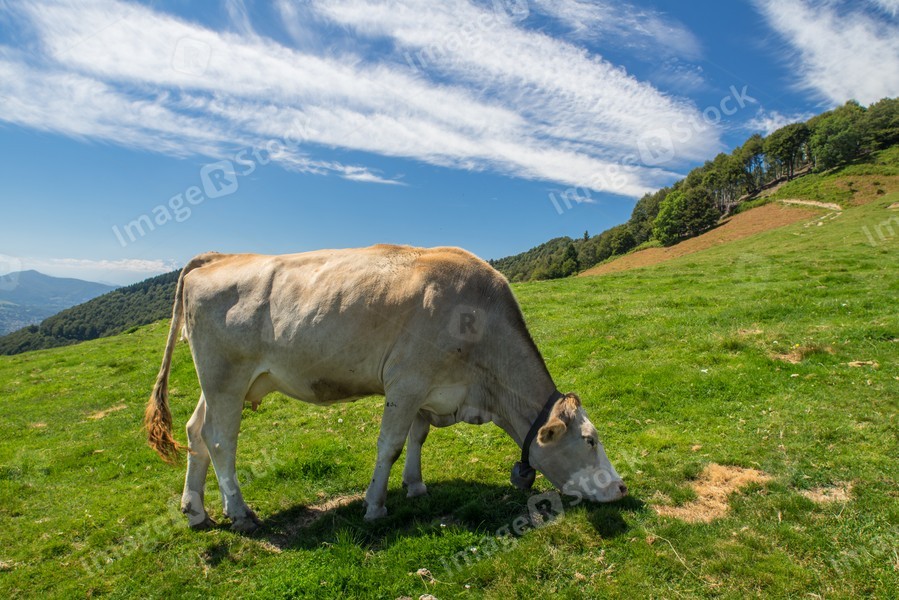 The pasture in the mountains. Cows grazing on the hills. Italy.