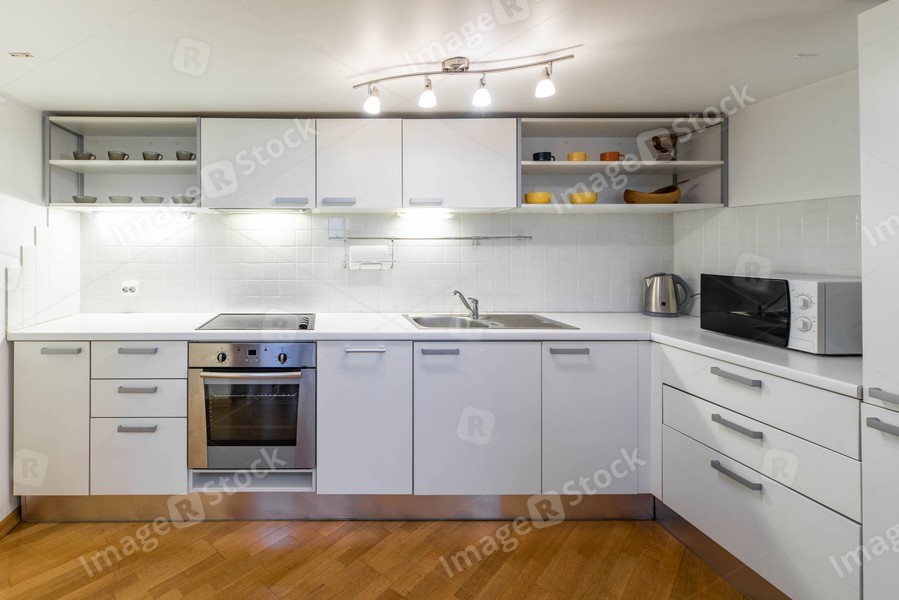 Kitchen in studio apartment. White interior. Wooden floor. White kitchen set.