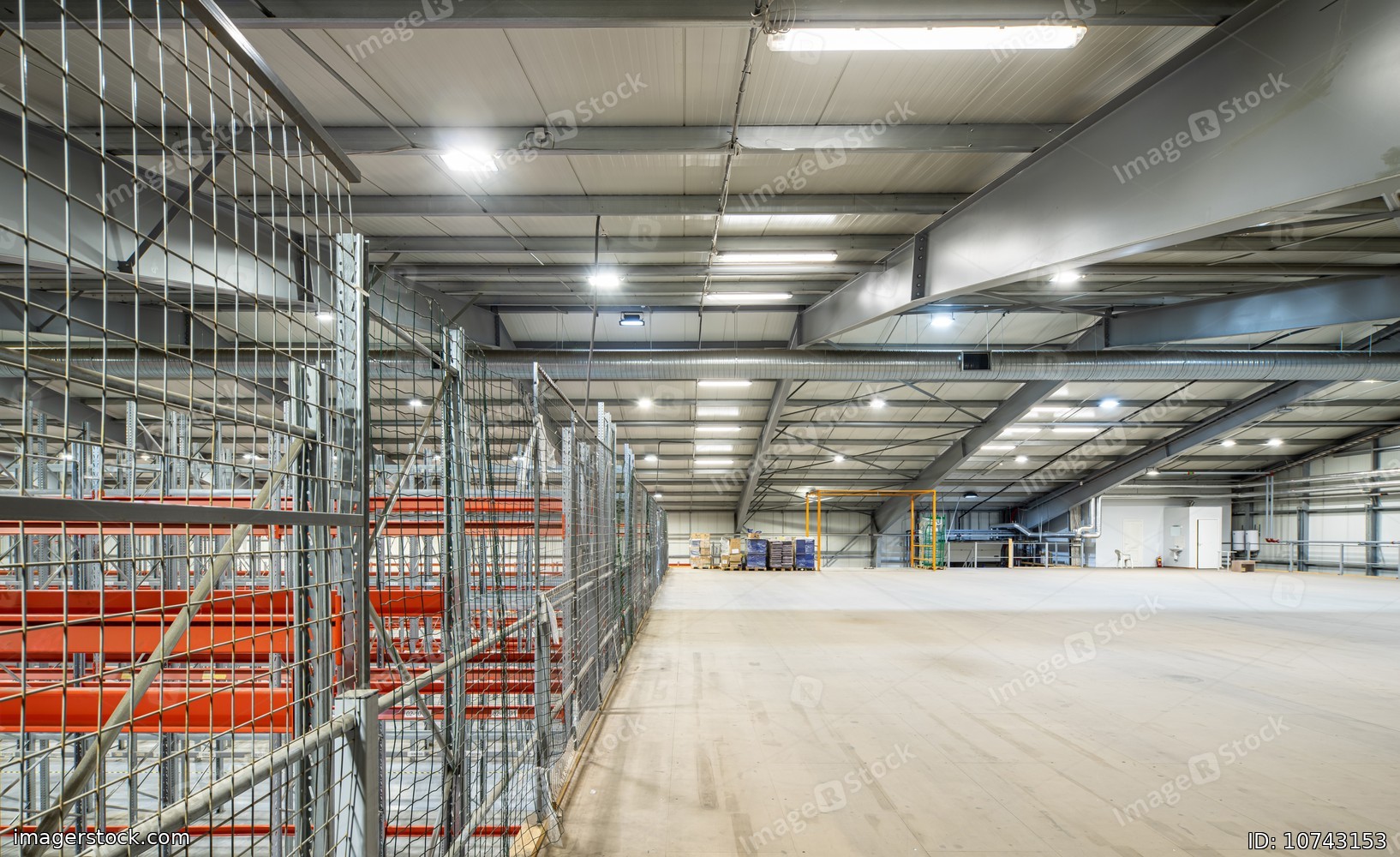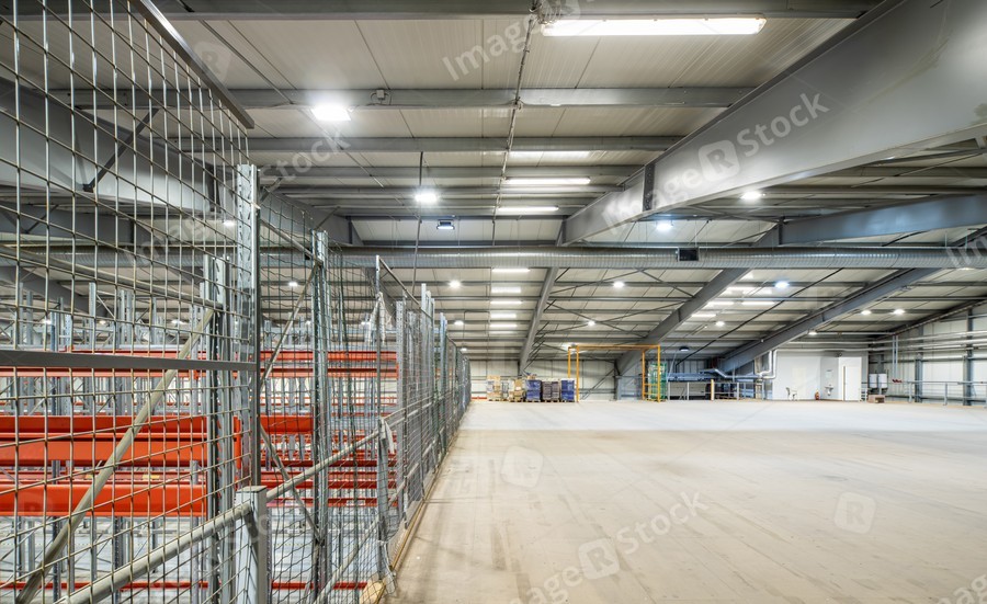Interior of huge empty storehouse. Industrial warehouse racking.