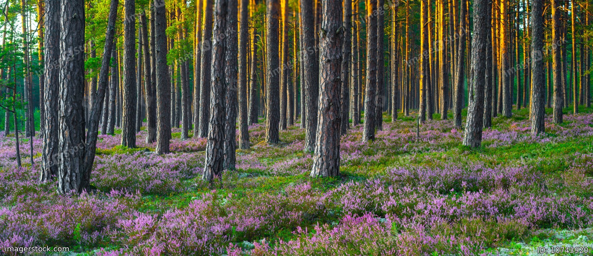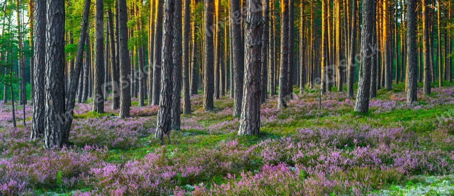 Sunny day. Blooming heather. Beautiful lawn in the forest.
