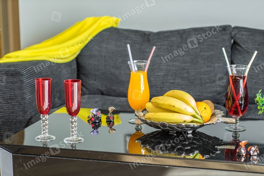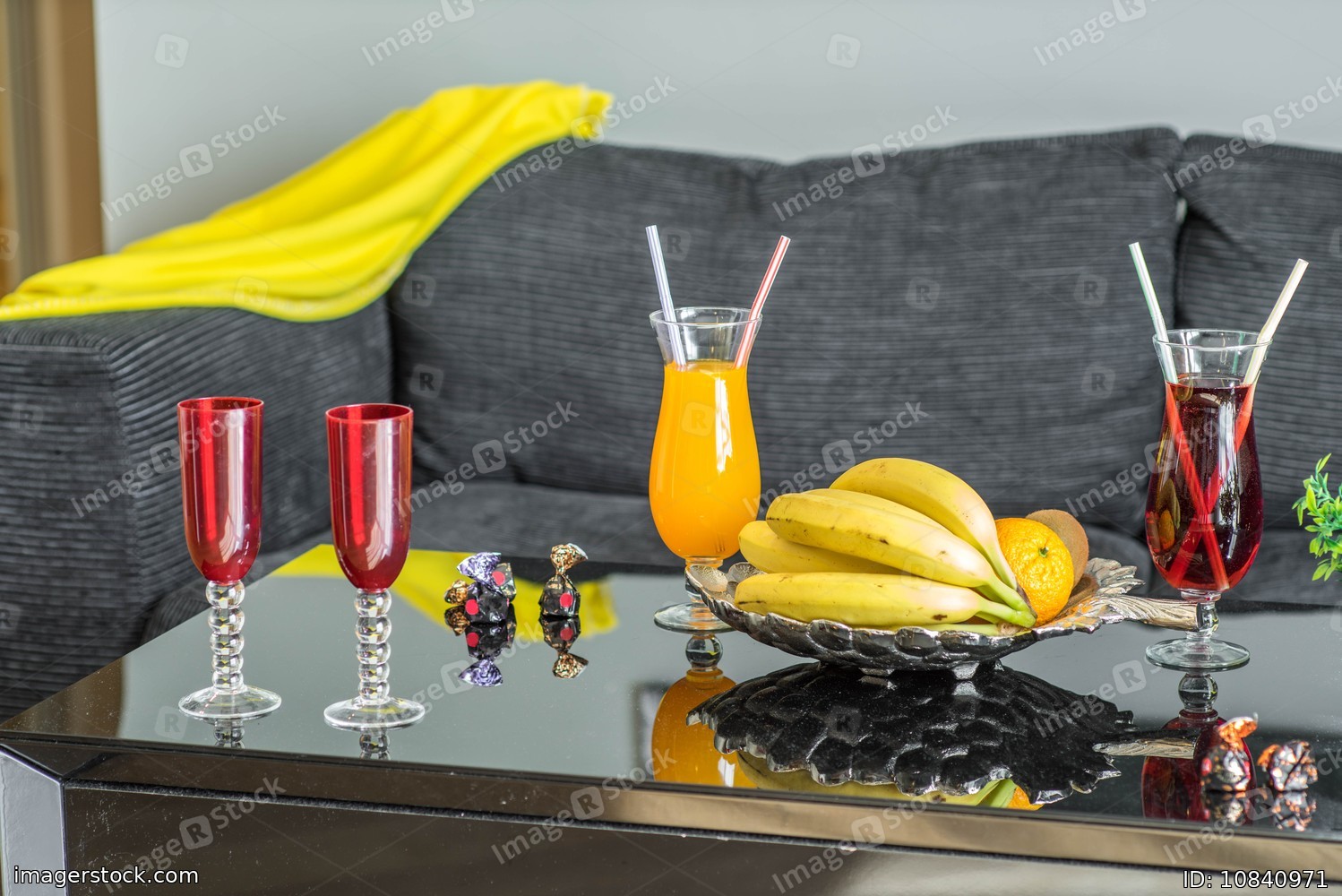 Bananas and orange on the plate. Couple of drinks. Red wine glasses. Close-up.
