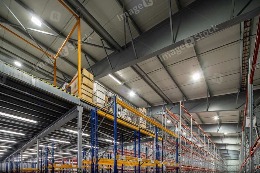 Interior of huge empty storehouse. Industrial warehouse racking.