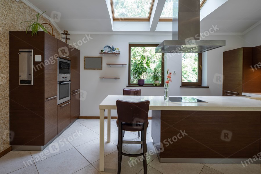 Modern interior of kitchen in spacious luxury apartment. Wooden kitchen set with white counter.