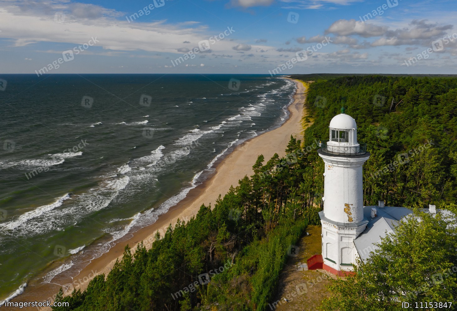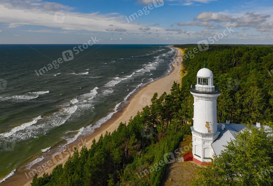 Top view of the sea and the Uzhava lighthouse. Blue sky. Green forest.