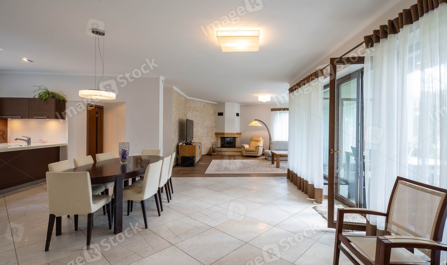 Contemporary interior of luxury apartment. Dark wooden table and cozy chairs. Living room with fireplace. Private house.