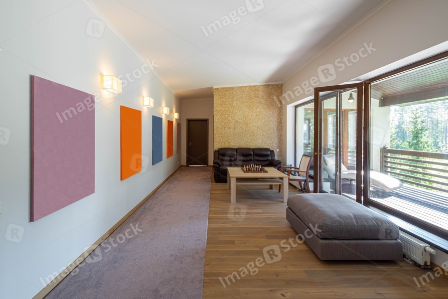 Light contemporary interior of private house. Wooden furniture. Leather sofa. Table with chess. Glass door to terrace. White walls.