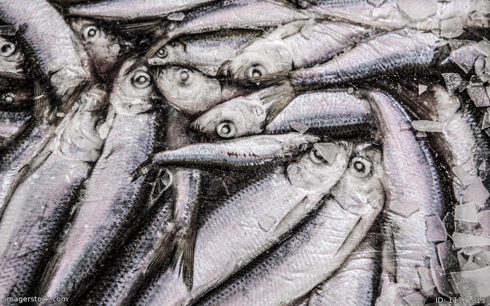 Close-up of frozen sprat in fish market. Winter fishing. Small silver fish production.