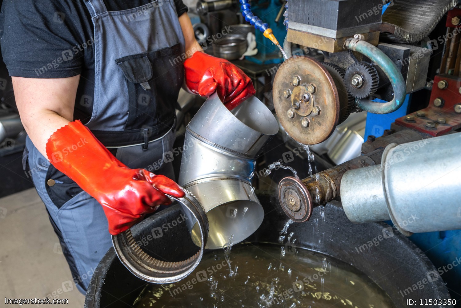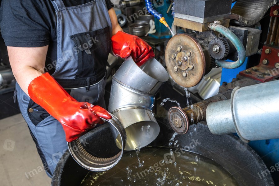 Worker at factory. Welding in a circle. Water cooling. Machine for spot welding of pipes.