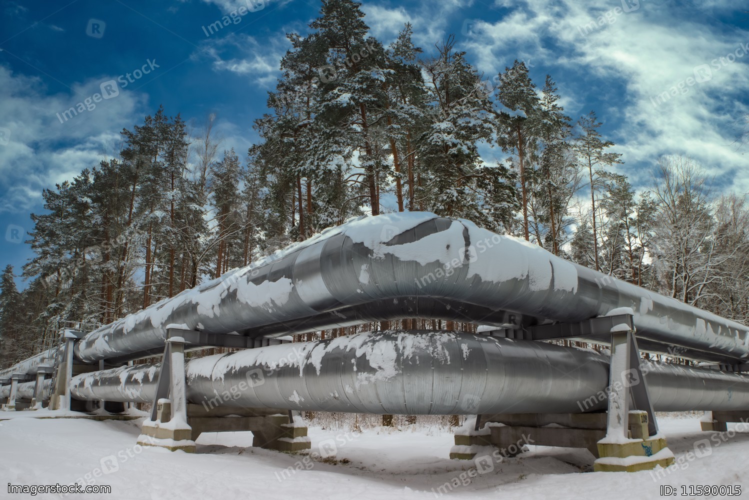 Huge industrial pipelines of central heating system. Snow on pipes.