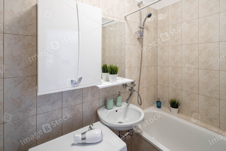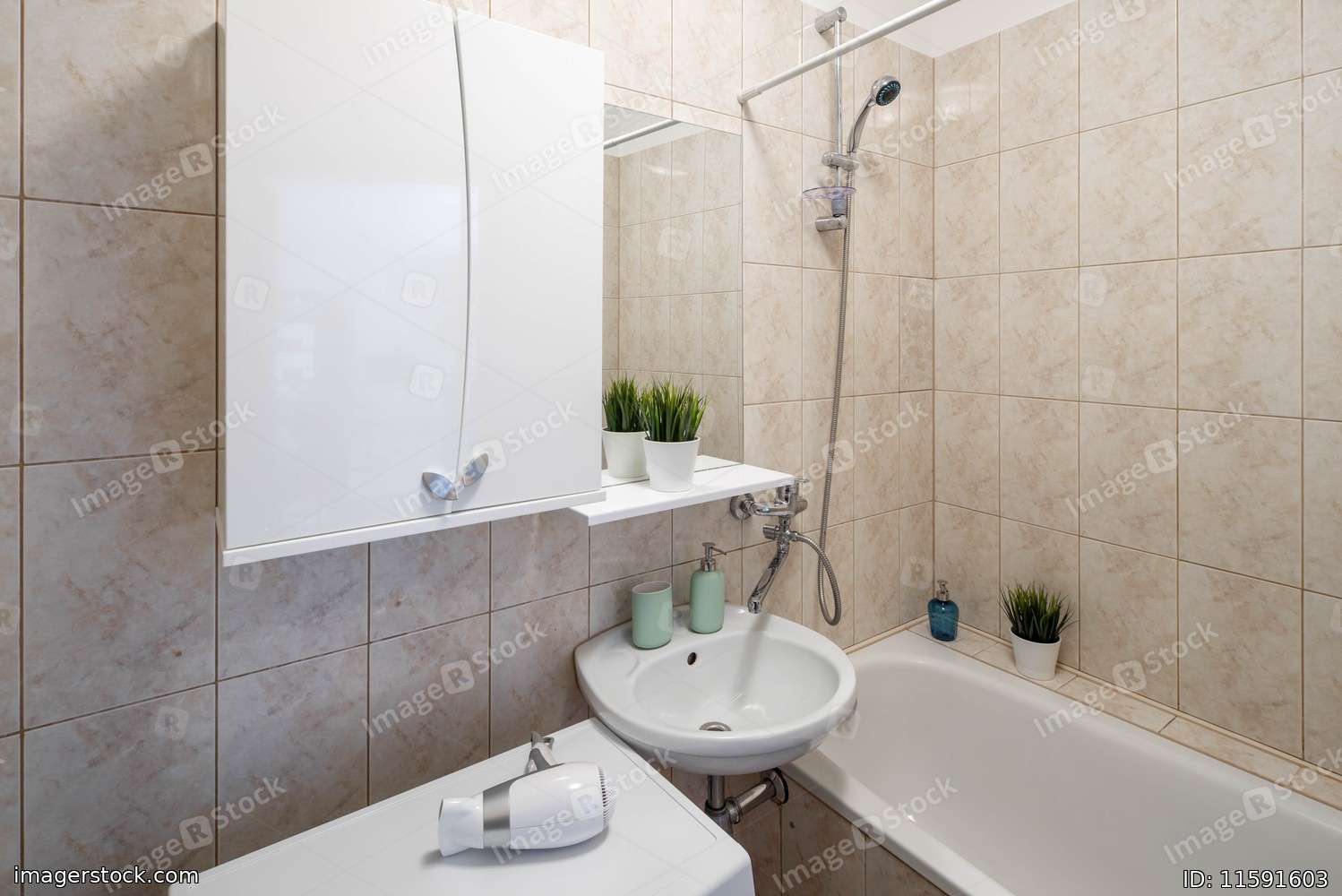 White sink with mirror. Bath and hairdryer. Beige tile in bathroom.