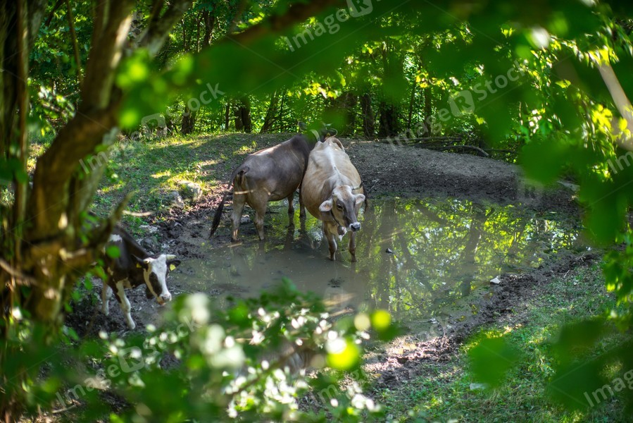 The pasture in the mountains. Cows grazing on the hills. Italy.